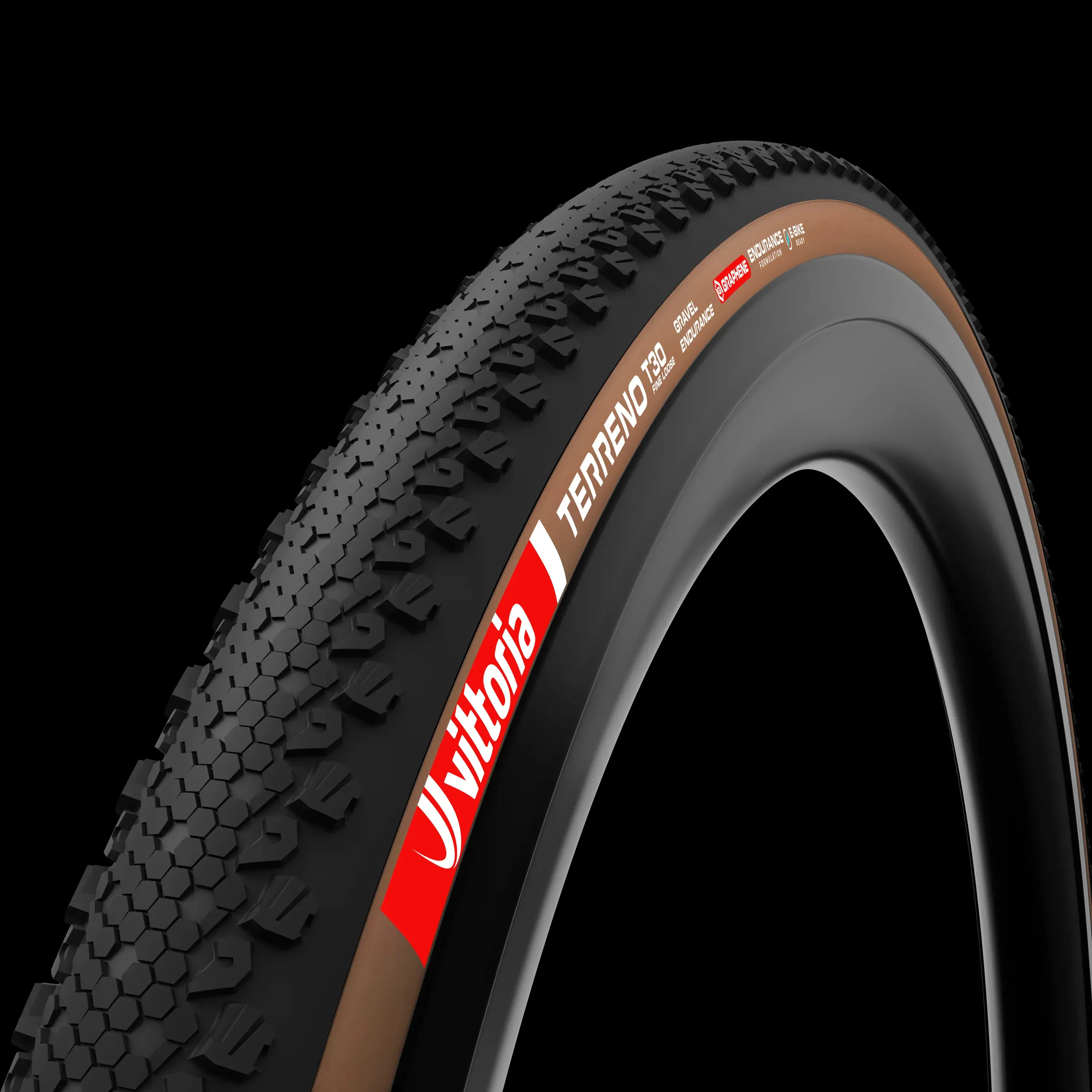 Гравійна шина Terreno T30 Fine Loose Gravel Endurance досягає ідеального балансу між швидкістю та контролем на швидкокатних гравійних покриттях. T30 має унікальну центральну смугу у вигляді риб'ячої луски і оптимізована для низького опору коченню, зберігаючи при цьому гальмівне зчеплення та стабільність у складних умовах. Ламелізовані бічні шипи розроблені для того, щоб врізатися у поперечні схили (off-camber sections), забезпечуючи покращене зчеплення в поворотах, тоді як плавний перехід протектора (gradual ramp-up) гарантує гладке, впевнене входження в поворот при нахилі. Все це виготовлено за нашою формулою Endurance з використанням Графену.