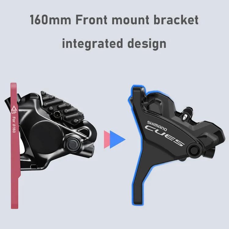 Гідравлічне дискове гальмо SHIMANO CUES Flat Mount, розроблене спеціально для широко використовуваних роторів діаметром 160 мм, має інтегровану конструкцію, яка усуває потребу в окремому адаптері. Його проста та легка 2-поршнева конструкція забезпечує надійне гальмування за будь-яких умов.