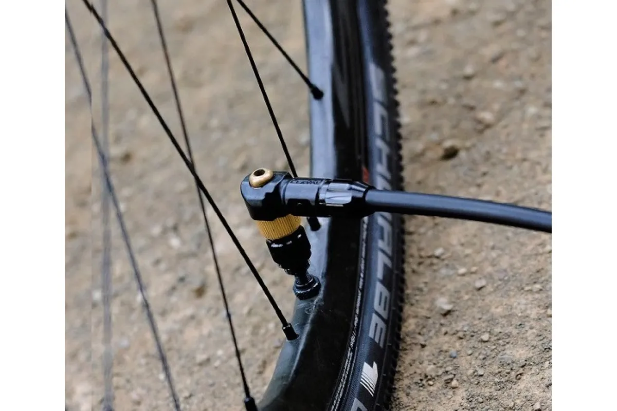 - Патрон является бескамерным и «переворачивается» для ниппеля Presta или корпуса ниппеля Presta с резьбой (со снятым сердечником клапана) для обеспечения большего потока воздуха для установки бескамерных шин.