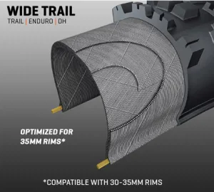 Конструкція Wide Trail (WT) оптимізує розташування та профіль протектора шини на сучасних, ширших ободах. Традиційні шини розроблені на основі старих, вужчих дисків і можуть створювати надто квадратний профіль шини, що призводить до неоптимальних характеристик. Шини WT оптимізовані для внутрішньої ширини обода 35 мм, але доведено, що вони працюють у діапазоні внутрішньої ширини обода 30-35 мм, залежно від переваг водія.