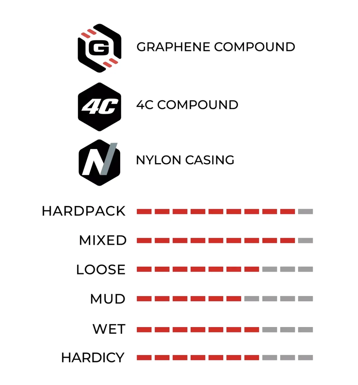 4Compound оптимізовані суміші на основі графену, стратегічно розміщені там, де вони потрібні, для неперевершеного поєднання швидкості, зчеплення та міцності. (липкі боковини, міцний і швидкий центр)