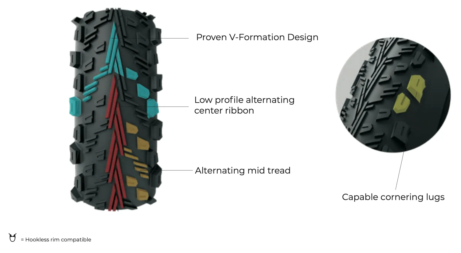 Середній протектор, що чергується, звужується до протектору, здатного проходити повороти, забезпечуючи чуйну керованість і передбачуване відчуття. Ці особливості покращують ефективність проходження поворотів, розміщуючи ефективні краї прямо навпроти шляху сил повороту, незалежно від кута нахилу чи повороту.