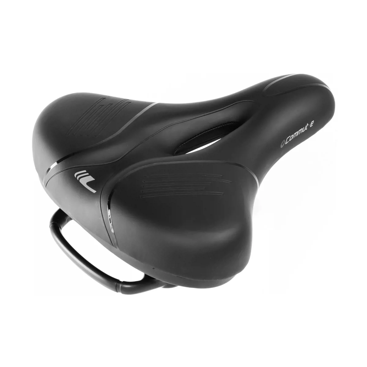 Зручне сідло COMUT-E призначене для комфортної їзди в міських умовах та на легкій місцевості. Комфорт забезпечується двома незалежними системами. Зменшення ударного тиску сідла та поглинання ударів сідла на сідничну кістку забезпечується шляхом розміщення шару піни, яка розподіляє тиск на більшій площі та пристосовується до форми тіла. Шар піни з більш високою щільністю, розміщений під ним, забезпечує загасання вібрації та підвищує стійкість. Заглиблення в центральній частині та отвір зменшують тиск в області між сідничними кістками та збільшують вентиляцію.