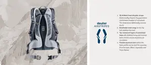 - Система спини Deuter Airstripes System, з двох вигнутих подушок із спеціальної піни з повітряним каналом посередині, що забезпечує хорошу циркуляцію повітря.