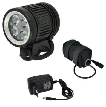 Зовнішній літій-іонний акумулятор (4x18650 7,4V 4400mAh) перезаряджається разом із включеним зовнішнім зарядним пристроєм. Час заряджання акумулятора - приблизно 3,5-4 год, приблизно 500 циклів зарядки без значних втрат ємності, захищені від повного розряду або перезарядки. Стан батареї позначається світлодіодним світлом (зелений - 100-75%, синій - 75-50%, жовтий - 550-25%, червоний - 25-5%, червоний спалах - 5%). Акумулятор підключається до світла кабелем 65 см.